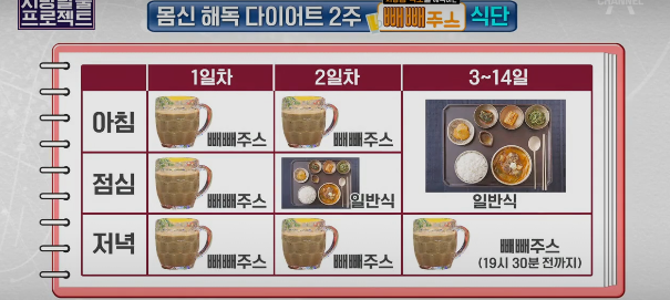 첫째날에는 3끼 모두를 빼빼주스를 먹고, 2일차에는 2끼, 3일차부터는 1끼를 먹는데, 꼭 저녁식사를 빼빼주스로 대신해야하네요. 다시 말해, 1일차 3끼를 먹고 2일차 아침까지 연속으로 4끼를 빼빼주스만 먹습니다.
