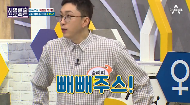 색이 영~ 예쁘지는 않은데요. 출연 패널들도 빼빼주스라는 이름에 큰 관심을 보이며 자리에서 들썩들썩... 빨리 공개해줘요, 현기증 난단 말이예요.