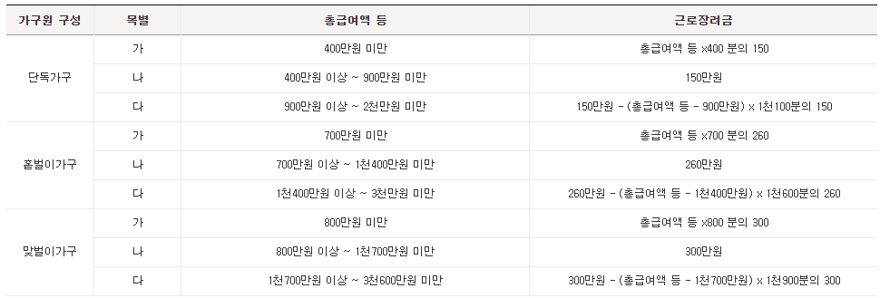 근로를 하는것에 비해 소득이 적어 생계가 어려운 근로자와 가구원을 돕기 위한 정책입니다. 가구원의 구성과 총급여액 등에 따라 근로장려금 지급액이 달라질 수 있는데요.