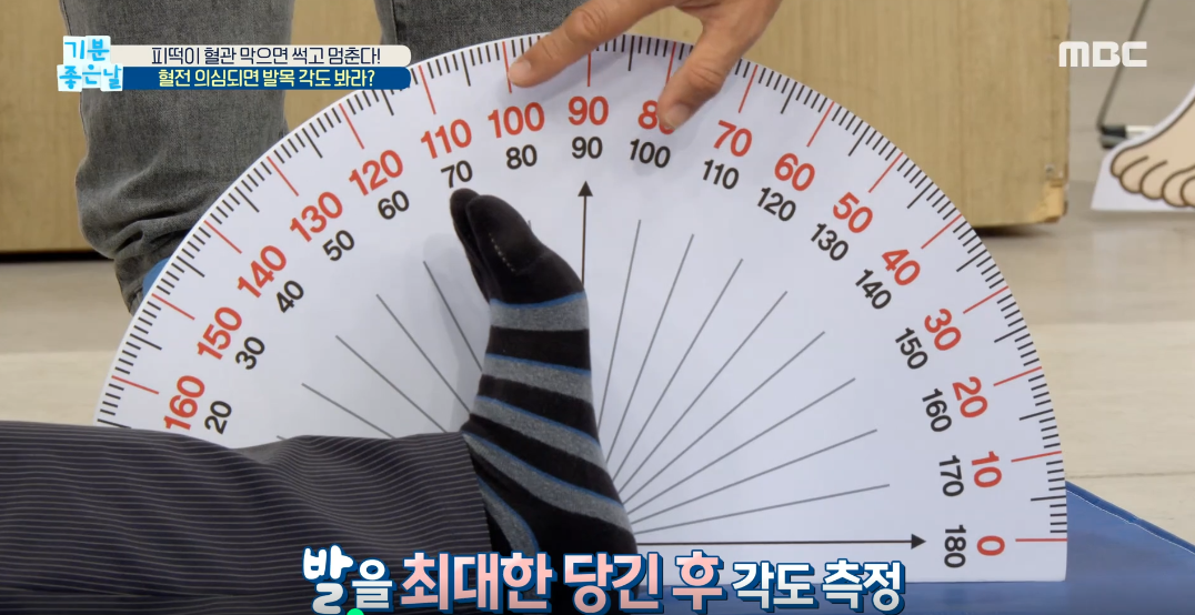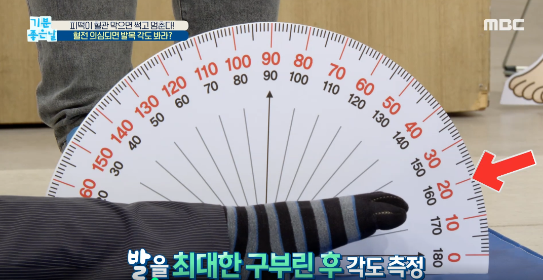 우선 각도를 준비합니다. 각도기의 중심에 발을 위치시키고, 발을 최대한 당기고 늘려서 그 차이를 계산합니다. 그 차이가 60도 이상이면 정상이다라고 판단합니다.