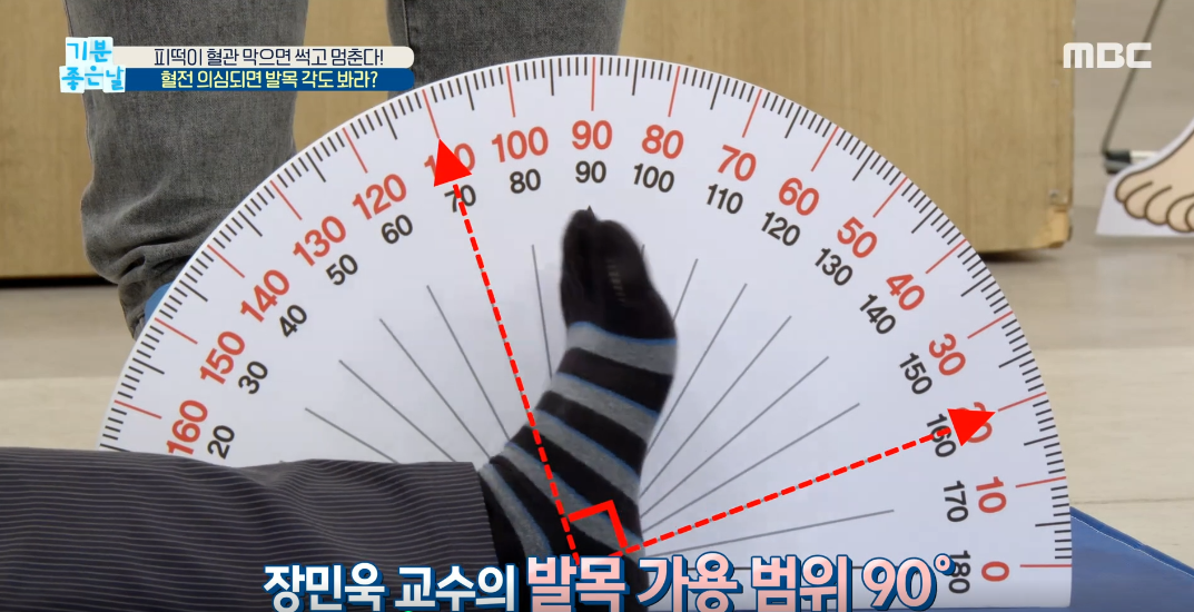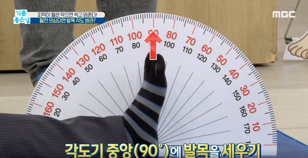 발목을 최대한 꺾을 수 있는 각도를 측정해서 하지 사용능력과 혈관건강을 가늠해보는 방법입니다. 여러분도 한번 따라해보세요.